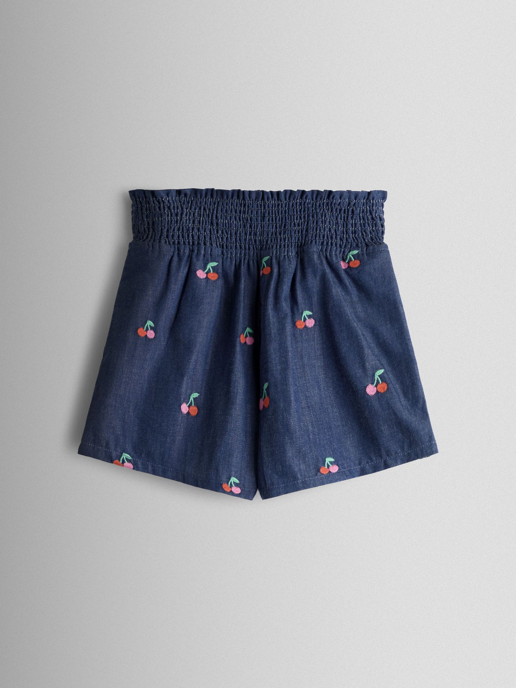 Blue Chambray Cherry Smocked Waistband Embroidered Shorts