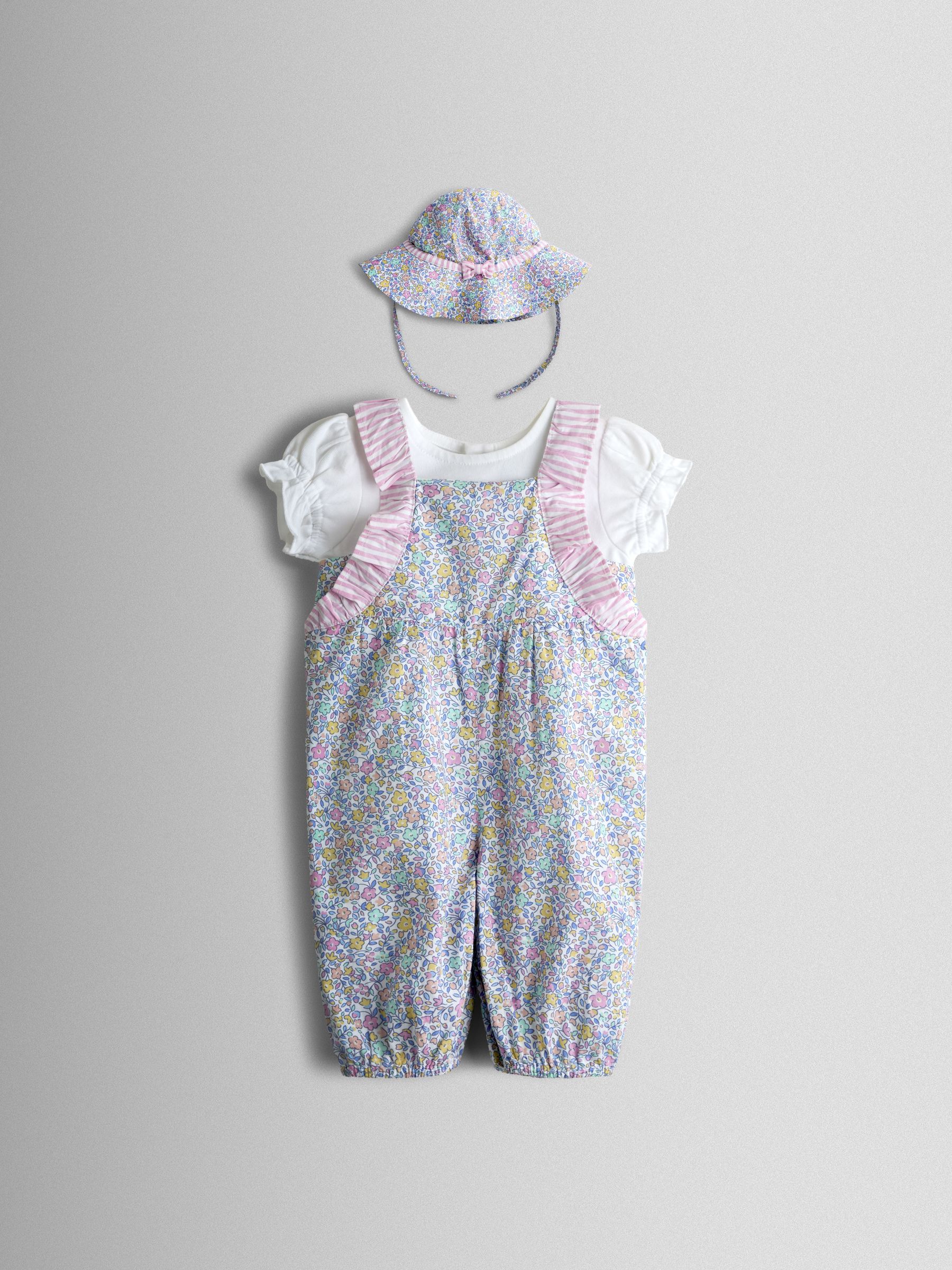 Cream Floral Spliced Dungarees T-Shirt and Hat Set