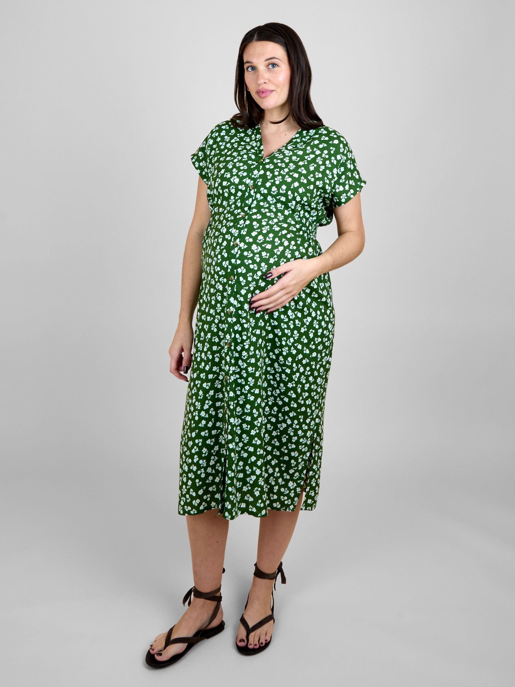 Khaki Green Button Through Ruched Drawstring Waist Maternity Midi Dress