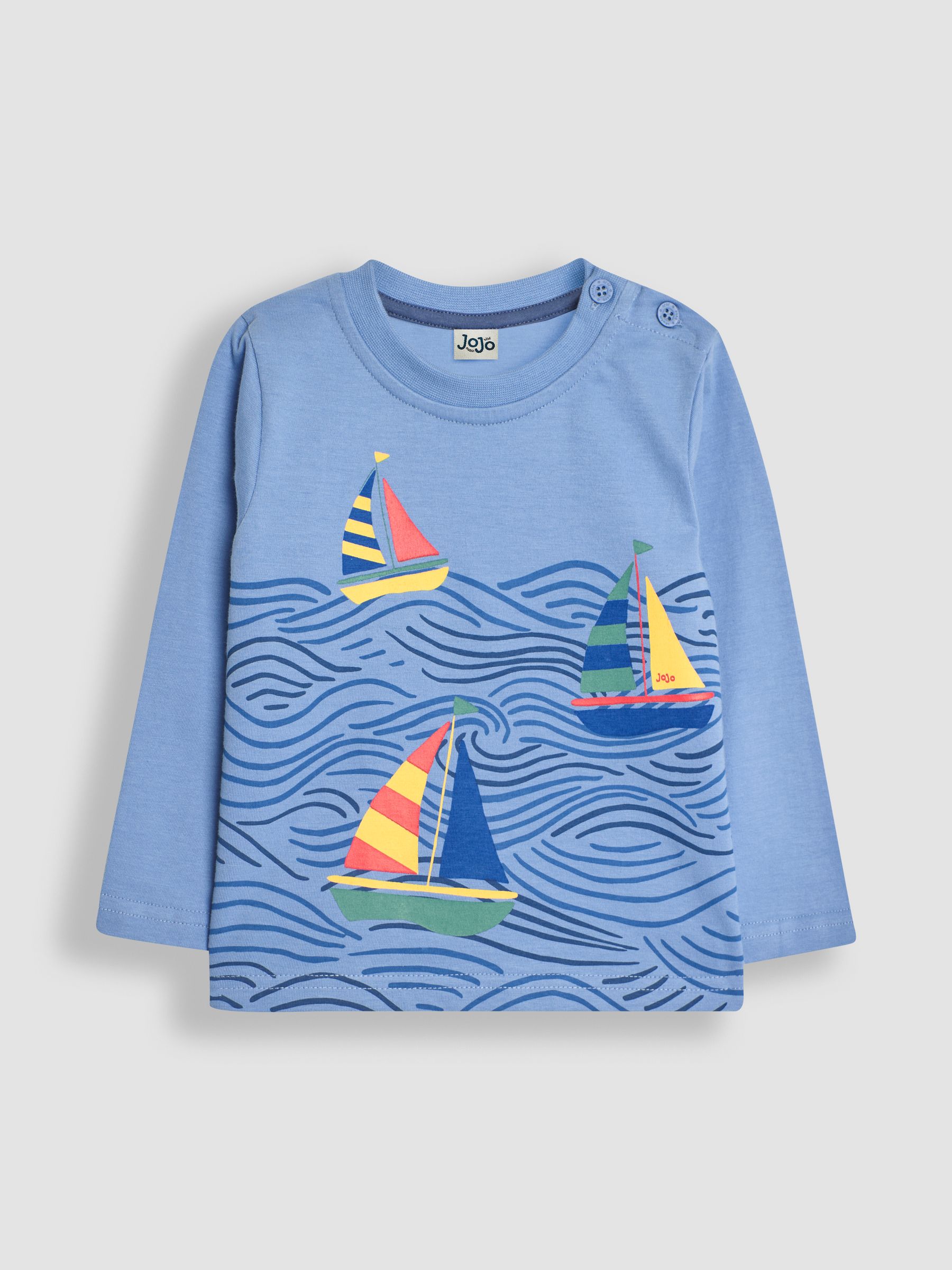 This boat-iful piece, crafted from oh-so-cosy cotton, is sure to make a splash in your little one's wardrobe. Oh, and there are lots of stretches for little explorers to rumble, roll and stroll into their day - they won’t want to take it off. Light blue long-sleeve top Colourful boat design Buttons to shoulder Round neckline MAIN: 100% Cotton Machine washable