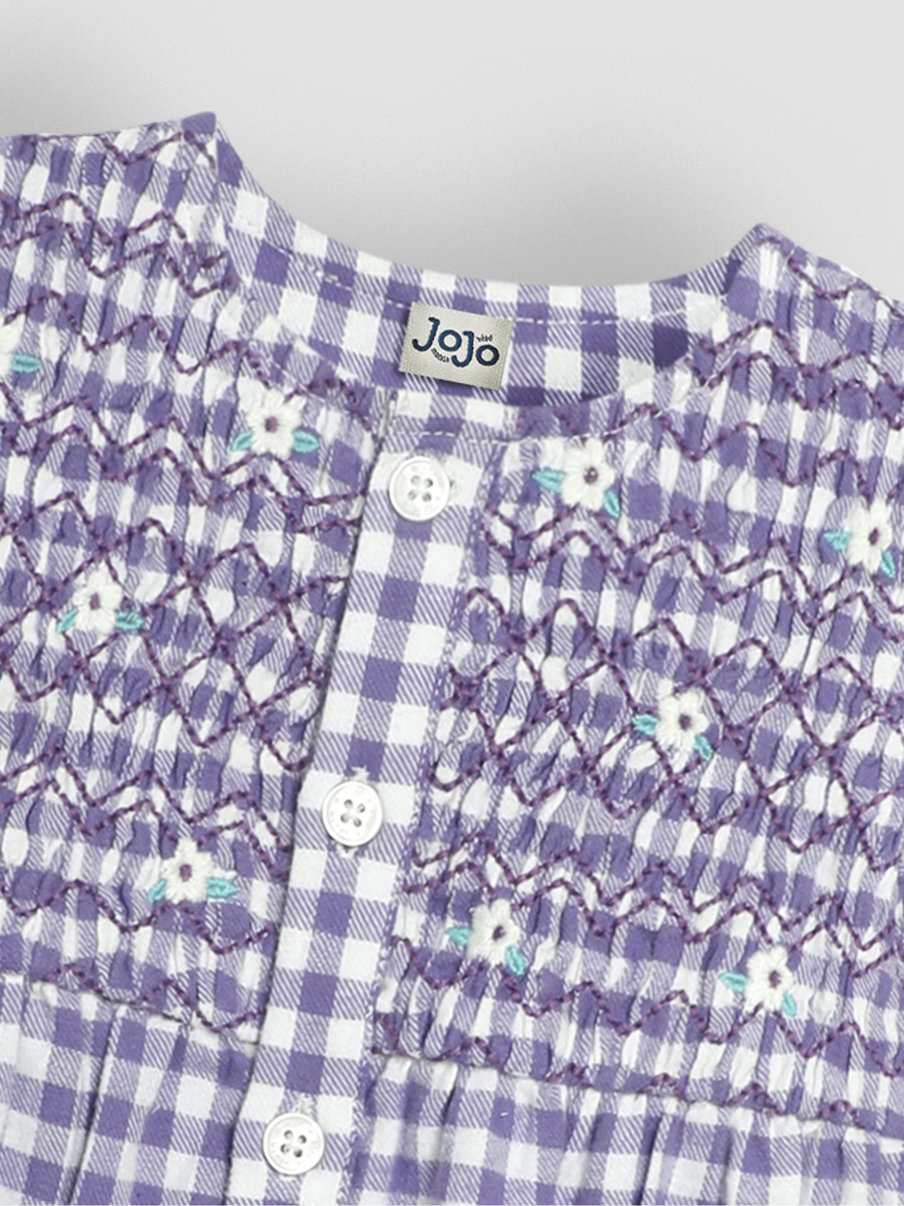 For cosy cuddly days and play all day days, our gorgeous gingham Smocked Dress and Tights Set is a go-to reliable style for whatever’s on the calendar. Little wrigglers will look as sweet as can be with the frilly details and smocked daisy front. Finish the look with the cream tights for a warm autumnal look. 2-Piece set includes a purple gingham dress with flower print and cream tights Frill shoulders Button-down fastenings Smocked detailing to the front Dress: 100% Cotton Other: 77% Cotton, 21% Nylon, 2% Elastane Machine washable
