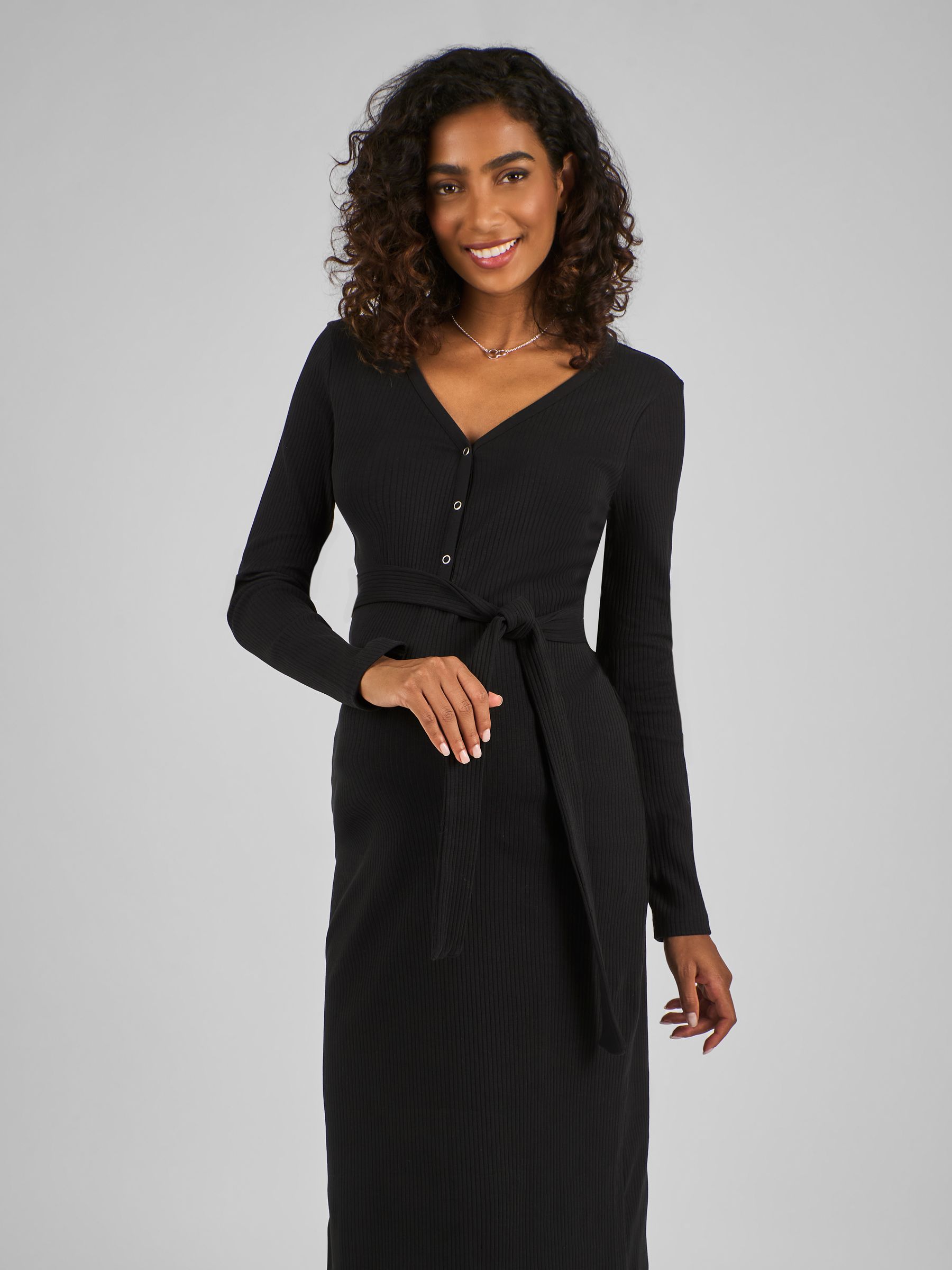 For lounge-about days, dress-up days, and don't-know-what-to-wear days, our Ribbed Popper Front Maternity Jersey Dress will quickly become a staple item in your wardrobe. Soft ribbed jersey fabric will stretch to fit your changing body shape, so you can wear it as your baby bump grows. Secure the dress with an additional waist tie to add definition to your bump, and unpop the front for a stylish V-Neck.