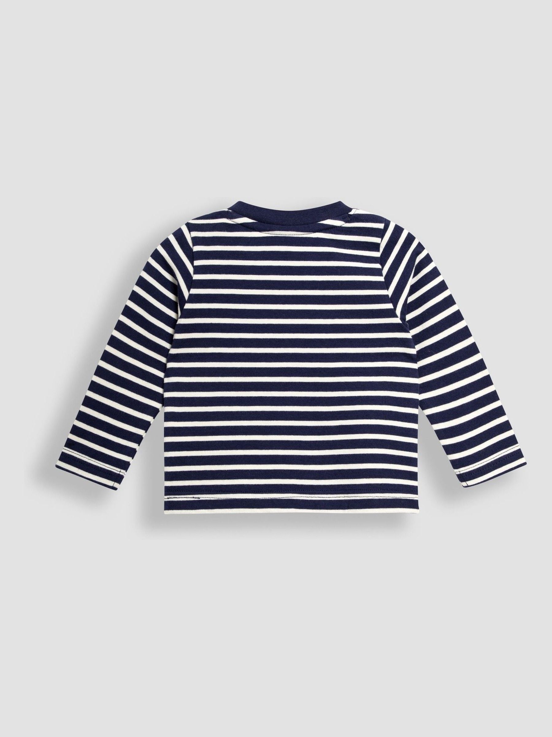 - Set includes neutral dungarees and a navy-striped long-sleeve shirt