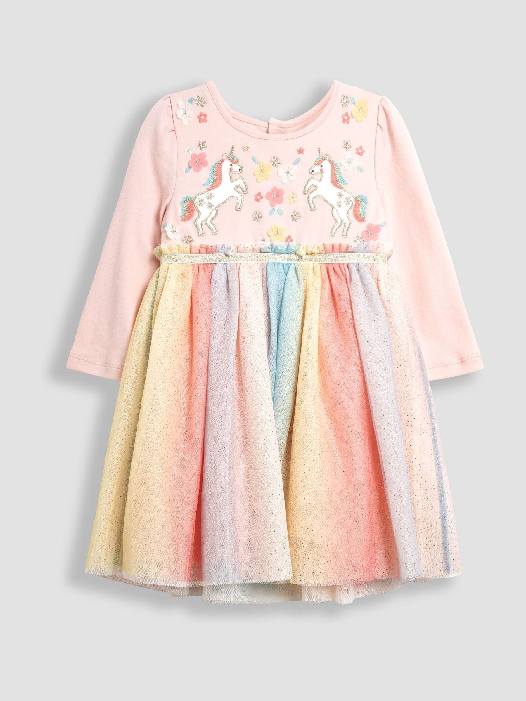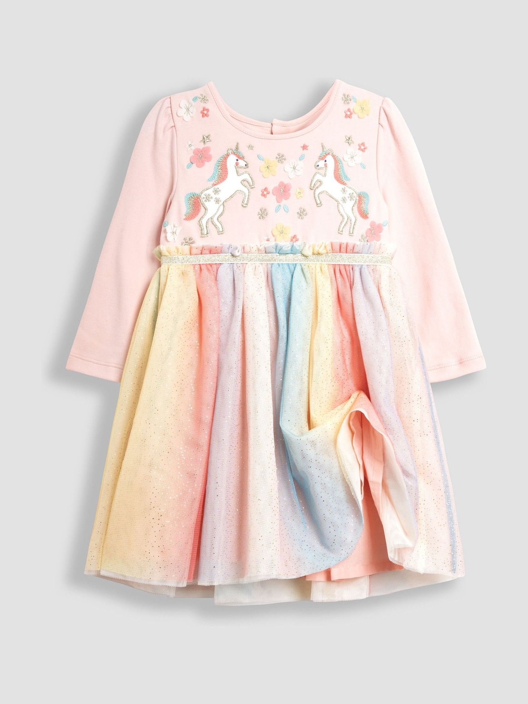 Step and twirl into magical days with this unicorn Long-Sleeve Appliqué Tulle Party Dress. Perfect for parties, celebrations (or for just feeling like a princess!) This dress features a beautiful rainbow gradient all over the skirt with stars scattered over the top tulle layer all wrapped together with a gold glitter band, and with two spellbinding appliqué unicorns and flowers - to give it an extra pop of magic. Tulle party dress Rainbow layers Stars all over the skirt Glitter band Long sleeves Unicorn and flowers appliqué Buttons up at the back Machine washable