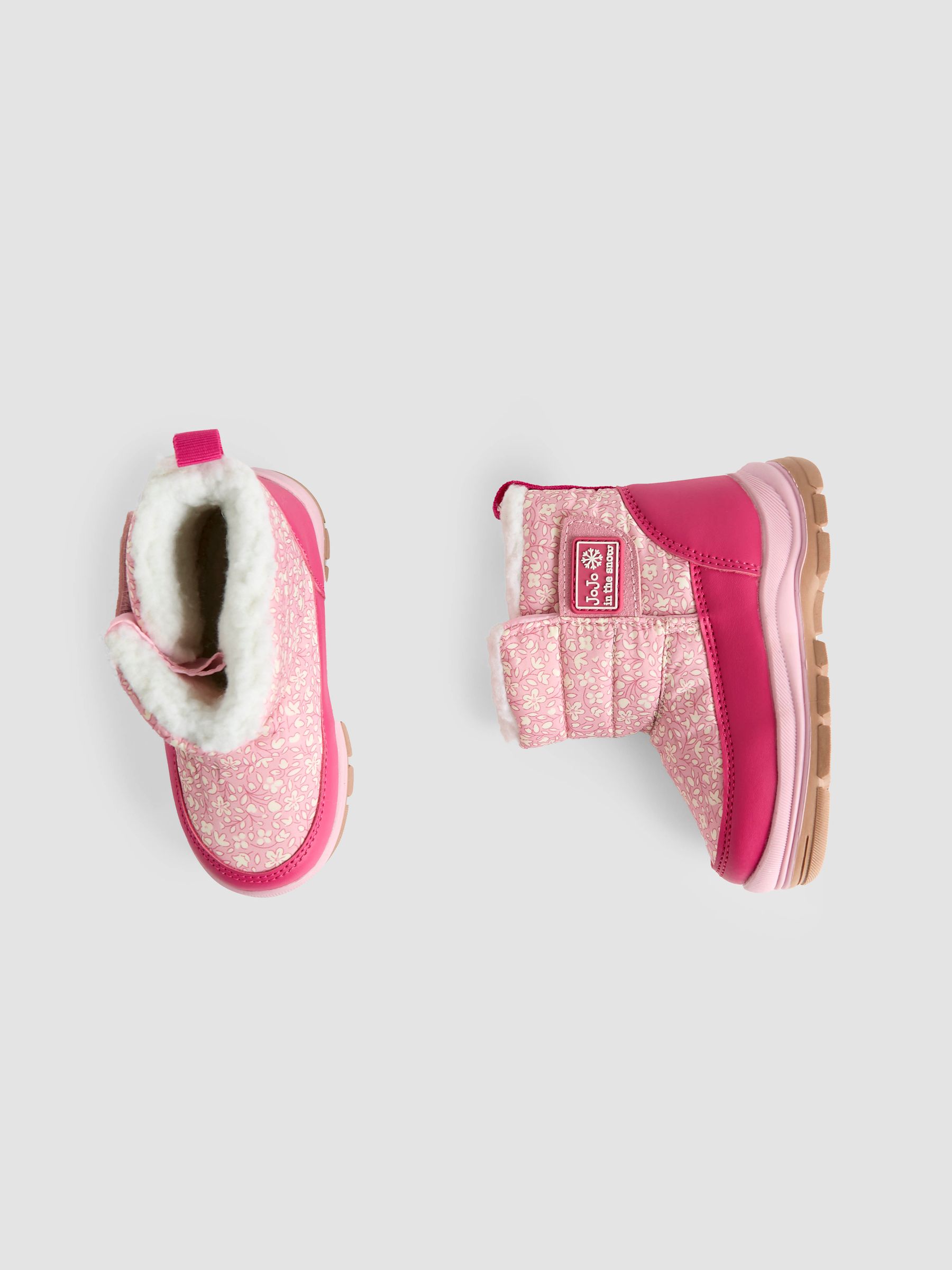 Stomping through snow, watch them go-go, in our Pink Cosy Snow Boots. Our snow boots have been bestsellers for years, and it’s easy to see why! Designed to keep little feet dry and warm in snow and rain, they are a must-have for chilly wet weather. The ditsy print adds a dash of fun, making every step a delightful run. With a fleece lining to keep toes so-snug and deep treads for a snow-hugging hug, these boots are ideal for all their frosty adventures. Durable water-resistant upper All-over ditsy print Cosy fleece lining trim for extra warmth and comfort Moulded sole with deep treads for extra grip in snow Velcro™ closures SHOE: Upper: Textile and Other Materials, Lining: Textile, Sole: Other Materials Surface wash only