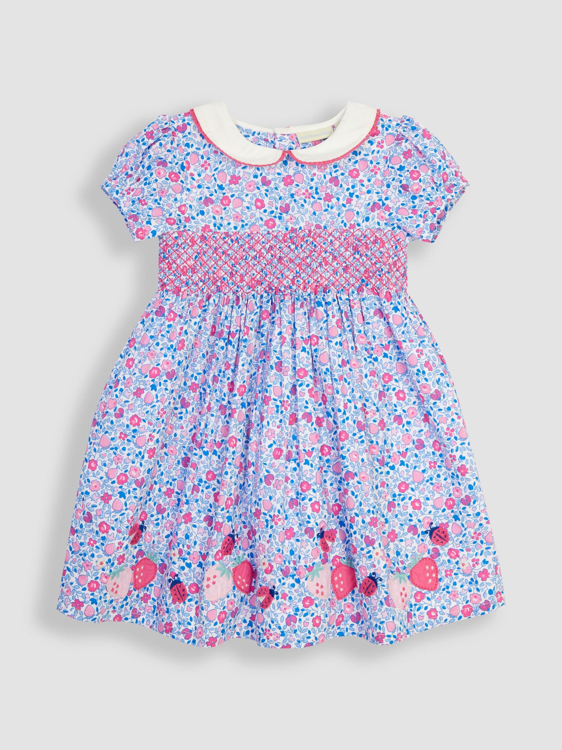 From sunny birthday bashes and family gatherings to weddings and parties, this colourful ditsy pink dress was made for summer celebrations. The embroidered strawberries and elegant Peter Pan collar give it a juicy smart look, while the smocked chest and floaty skirt add plenty of movement for twirling. For little crawlers, finish the look with matching knickers to hide their nappy. Embroidered strawberries to skirt Comes with matching knickers (up to 2-3yrs) Short puff sleeves Smocked front White Peter Pan collar Gathers at waist for full effect Back button fastening for easy dressing Floaty skirt 100% Cotton, Lining: 100% BCI Cotton Machine washable