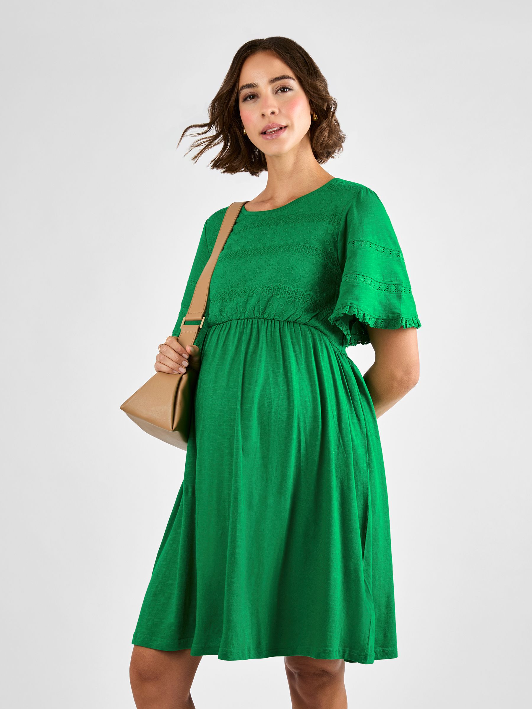 Make getting dressed oh so easy with bump-approved broderie. This comfy jersey dress is the perfect pick for sunny strolls, lazy lunches, and so much more, with its sweet broderie details and puffed sleeves giving it an elevated, day-to-day feel. You won't want to take it off! Green jersey mini dress Broderie bodice Waist tie detail Puffed sleeves Machine washable