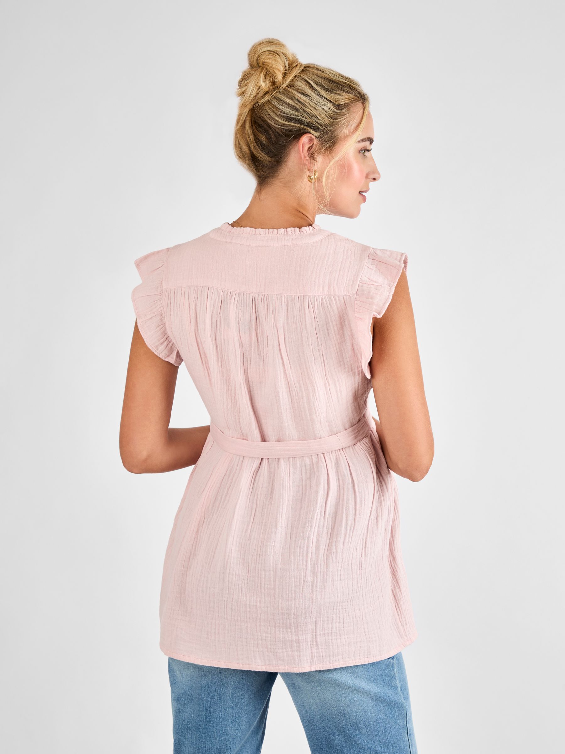 Dainty frills for sunshine spills, this Frill Sleeve Textured Maternity Blouse radiates breezy comfort and blushing charm. Perfect for dressing for spring days, this top has a waist tie that highlights your growing bump and maintains a flattering silhouette so you can feel your best through every stage of your pregnancy.
