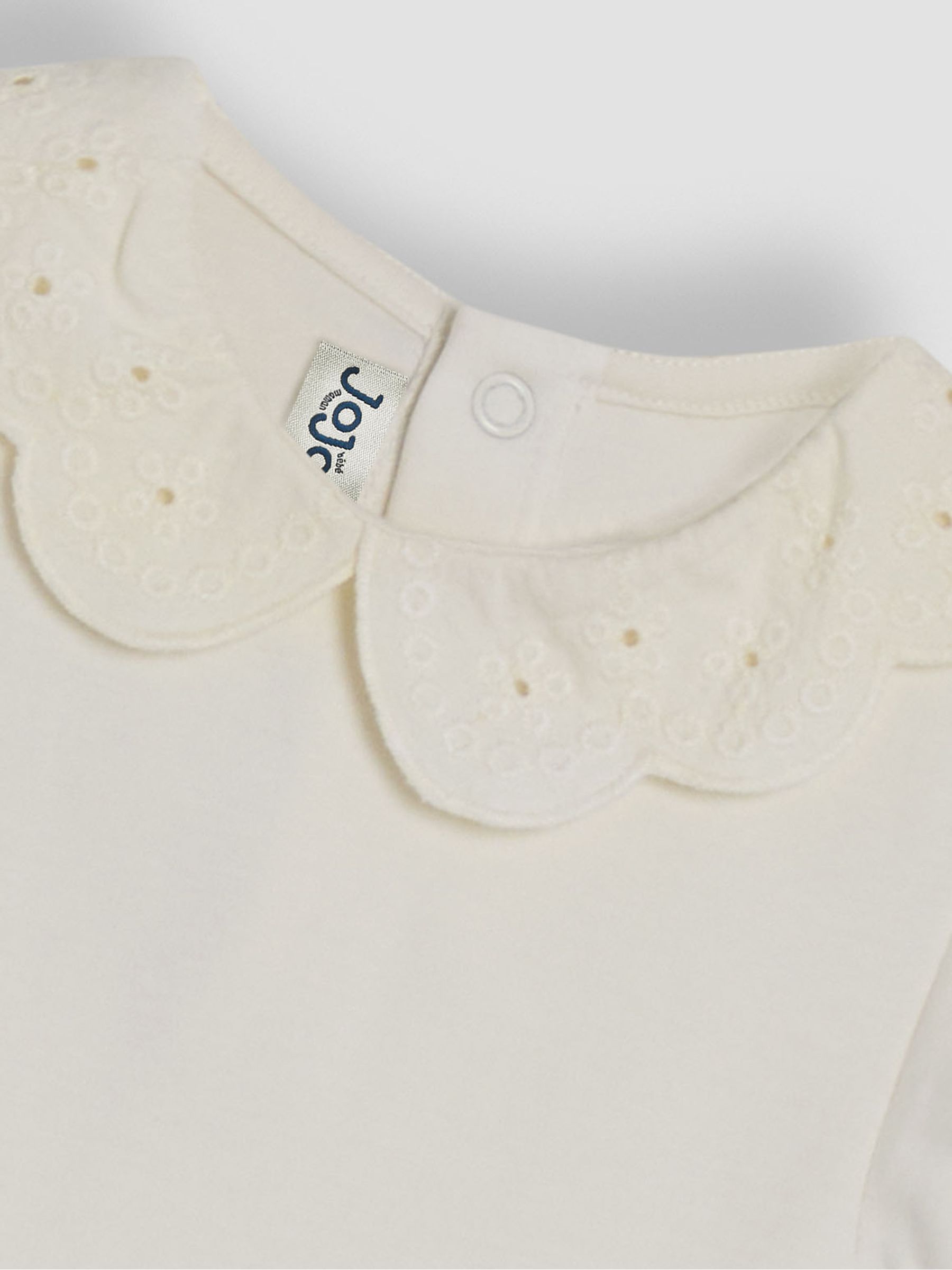 Take a classic bodysuit and add a dainty and delicate pop of charm! With its eye-catching broderie Peter Pan collar, this simple bodysuit was made for every day, and is guaranteed to go with anything. So add an oh so sweet spin to any little outfit, oh, and the crotch poppers ensure that changing is easy peasy. Cream short-sleeved bodysuit Poppers at the crotch for easy changing Peter Pan broderie collar KEEP AWAY FROM FIRE Machine washable