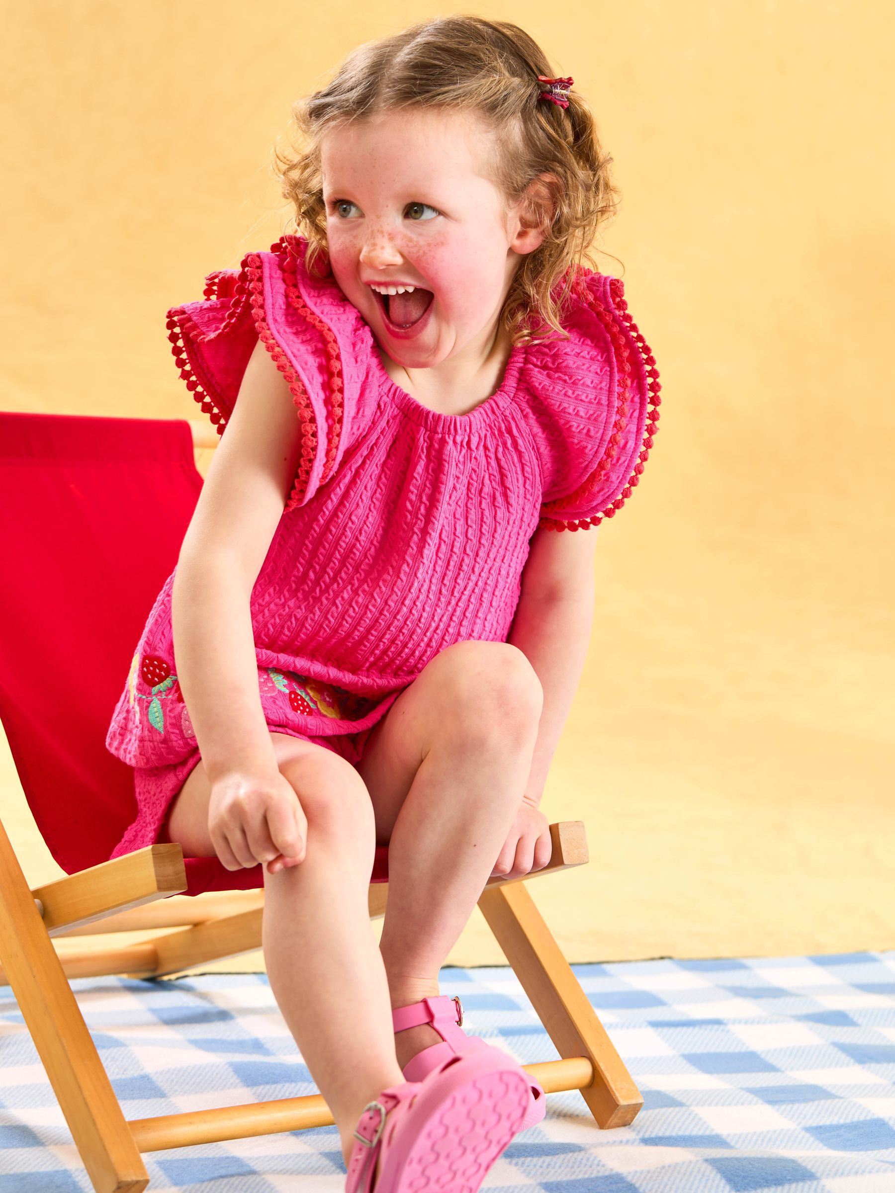 This eye-catching 2-Piece Embroidered Frill Sleeve T-Shirt & Shorts Set was just made for fun-filled holidays well spent. The flowy top with ruffled sleeves is perfect for staying cool as they run and play, and with the super sweet addition of the strawberry and flower embroidery, your little one will stand out as the sweetest pick of the bunch! Pink jersey top and shorts set Ruffled short sleeves with pom pom detailing Square neck Strawberry and flower embroidery Elastic waist shorts Machine washable