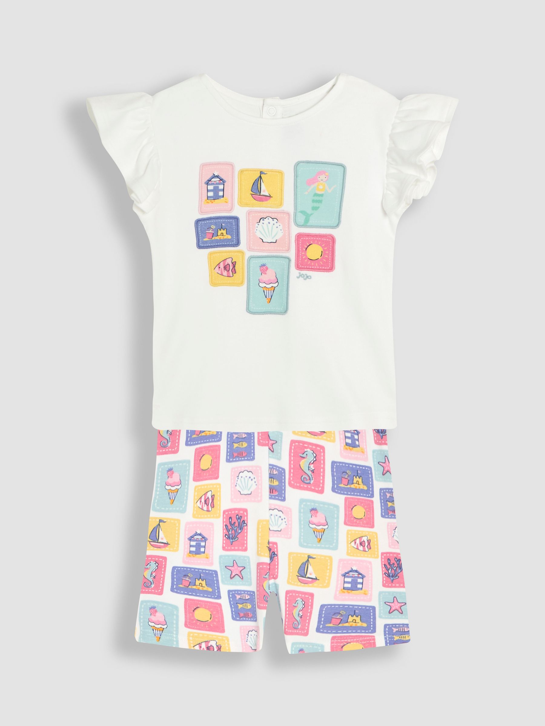 Dress for seaside adventures in this colourful and vibrant 2-Piece Appliqué T-Shirt & Shorts Set. With fluttery frilled sleeves made to dance with the summer breeze as well as the pastel stamp pattern brimming with beachy motifs, there really is no better style for those sun-cream scented, sand scattered days. White T-Shirt with frilled sleeves Appliqué colourful beach stamps Back buttons for easy dressing Colourful Elastic waistband Floral buttons on ankles Machine washable