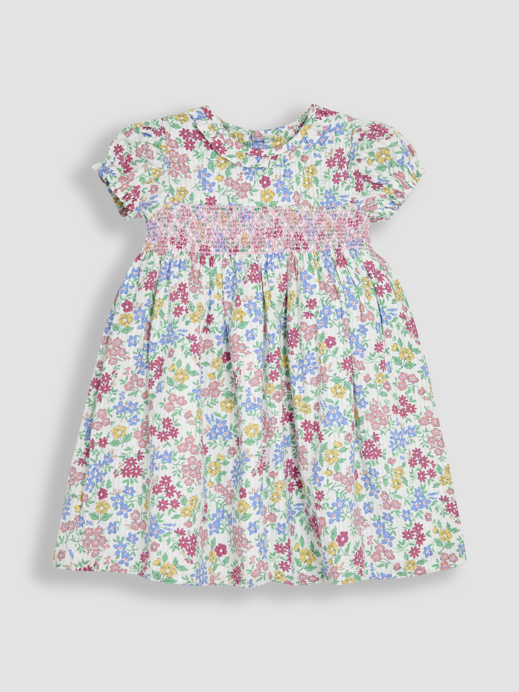 Nothing will make them want to flutter and spin into spring as much as this ditsy Floral Smocked Woven Dress. Perfect for garden parties and picnic play dates, this smocked dress has a blue all-over flower print and a sweet broderie ruffled collar. The matching briefs complete this lovely look, making it a twirl-worthy spring staple. Short puffy sleeves Blue floral print dress Smocked embroidery Frilled broderie collar Matching floral briefs for sizes up to 2-3 years Machine washable